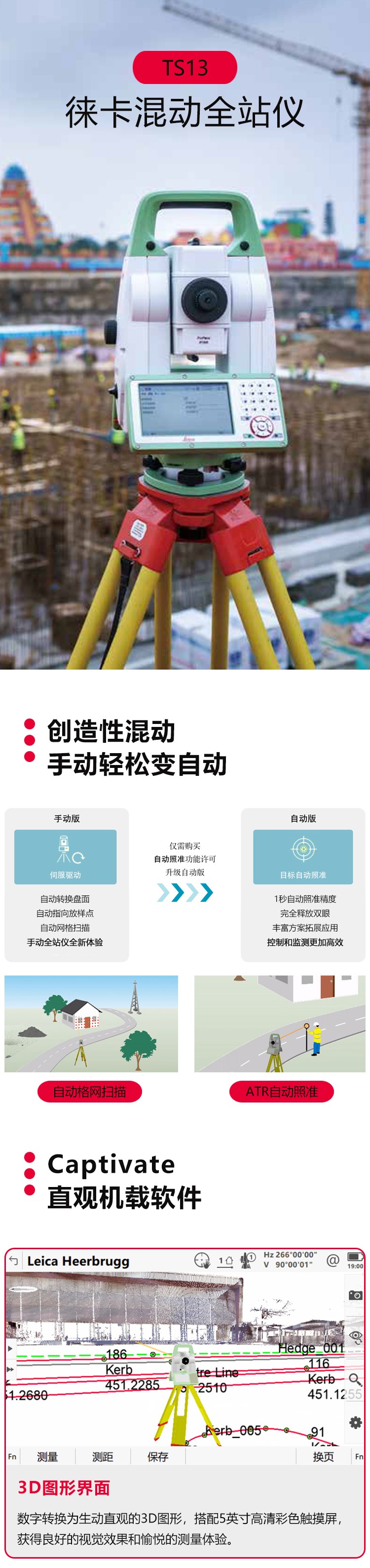 專業測量全站儀徠卡TS13自動型全站儀按需選配,“定制”您的測量機器人選配搜索/鎖定,無需返廠加裝,購買升級更靈活,不為用不到的功能付費1”自動照準精度,釋放雙眼,控制&監測更高效,豐富方案拓...
