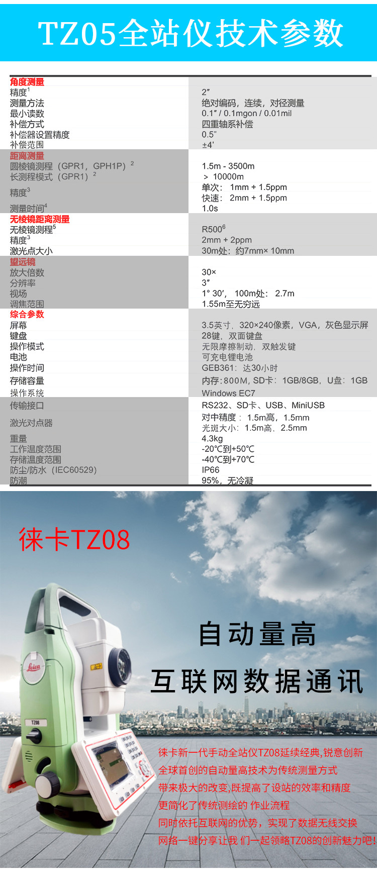 徠卡測量系統匠心制造、再續經典。新一代手動型徠卡全站儀TZ05延續了前 代穩定可靠的產品性能,并帶來了別具匠心的升級之道。全新升級的測 距模塊讓測量成果更加可靠,能夠更快速的完成日常測量任務;全新升 級的工藝品質,輕松應對各種極端環境的挑戰。徠卡TZ05全站儀,感受全新升 級的測量魅力。