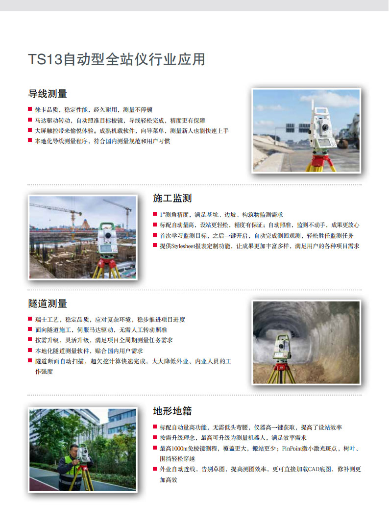 1”測角,1mm+1.5ppm測距,滿足測繪、施工全周期應(yīng)用需求,標(biāo)配自動量高,愉悅測量體驗徠卡測量全站儀產(chǎn)品擁有豐富的測量解決方案,經(jīng)過長期的積累,無論基礎(chǔ)測繪還是工程測量,或者是監(jiān)測檢測,亦或是特種測量,我們都有合適的解決方案供您選擇。