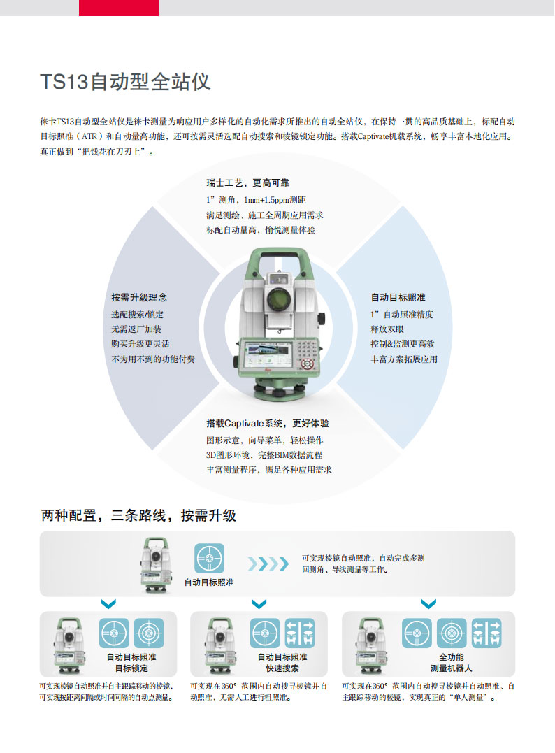 徠卡TS13自動型全站儀具備自動量高模塊,精度高達1mm,無需俯身屈膝,測量更輕松,設(shè)站更高效,減輕人工丈量誤差。
